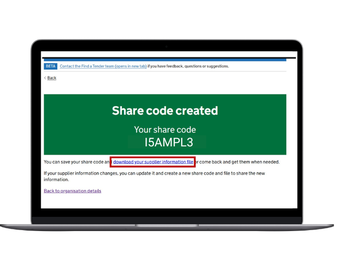 - Once complete, you’ll be asked to ‘Confirm and get share code’. A share code will be displayed, along with the option to download your supplier information file for easy sharing. With this, you are officially bid-ready.